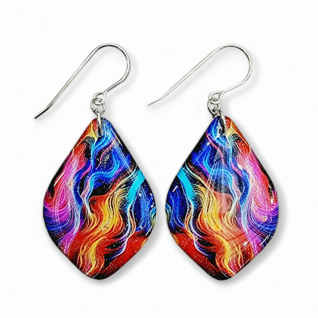 Introducing our colourful earrings, crafted from quality resin and adorned with an intricate rainbow design. Enhanced with shimmery highlights and lightweight for comfort, these earrings are finished with surgical steel hooks for sensitive ears.